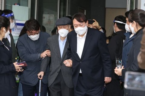 (사진2 설명) 윤 대통령이 지난 2021년 4·7 서울시장 보궐선거 사전투표 첫날인 2일 서울 서대문구 남가좌1동 주민센터에 마련된 사전투표소에서 부친인 고 윤기중 연세대 명예교수와 함께 투표를 마친 뒤 나오고 있다. ⓒ연합뉴스