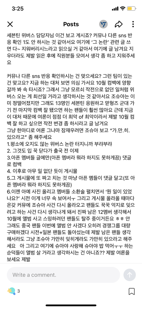 공감 못 하겠다는 애는 뭐냐 글 안봄? 소통하려고 온게 아니잖아 아픈멤버 방패세우는게 이제라도 정신차려서 소통하려고 온거랑 같냐