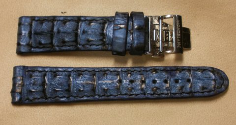 블랙 컬러 엠보싱 소가죽과 메탈 블루 컬러 리얼 악어 가죽으로 제작한 핸드메이드 천연 가죽 시계줄입니다.(마디샤 가죽공예)