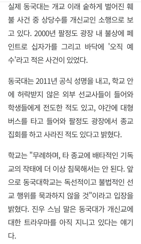 기사에서도 정확하게 언급하셨듯 기독교라기 보다는 개신교임 내 주변에만 봐도 천주교인 사람들은 보통 유하고, 각종 이상한 말로 갑분싸 만드는 사람들은 죄다 개신교였음 (예: 할머니 돌아가셨다고 슬퍼하는 친구한테 너네 할머니 교회 안 다니셨는데 지옥 가셨을 거 아냐ㅠㅠㅠㅠ 등)