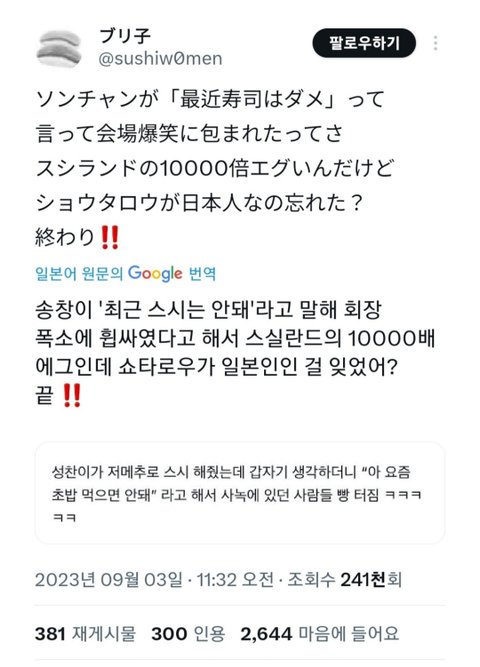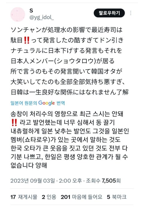 음중 사녹 때 팬들이 저녁 메뉴 추천 해달라니까 후쿠시마 오염수 때문에 초밥 안된다고 ㅋㅋㅋㅋ
