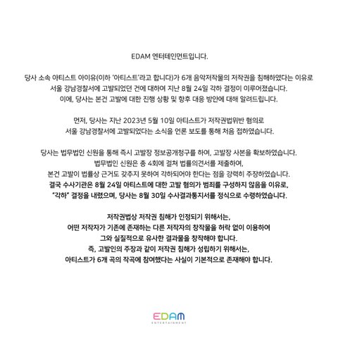 나아가 수사기관의 이번 각하 결정은 앞서 이 사건이 어떠한 법률적 요건도 갖추지 못한 채 악의적으로 이루어진 것임을 증명하는 것이며, 고발인을 비롯해 익명성을 이용하여 아티스트가 실제로 창작에 관여하지 않은 곡들에 대한 표절 혹은 저작권 침해 논란을 부추기는 주장들이 얼마나 터무니없고 악의적인 행위인지 명백하게 확인해주는 결과라 할 것입니다.