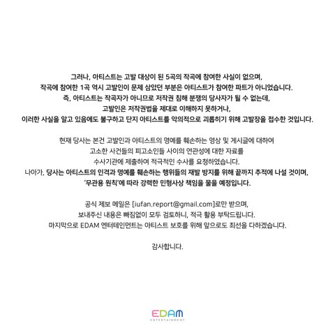 올해 5월경 성명불상자가 소속 아티스트 IU(본명 이지은, 이하 아티스트)를 저작권법위반 혐의로 고발한 사건에 대해