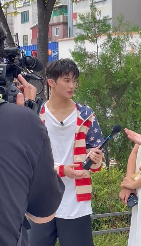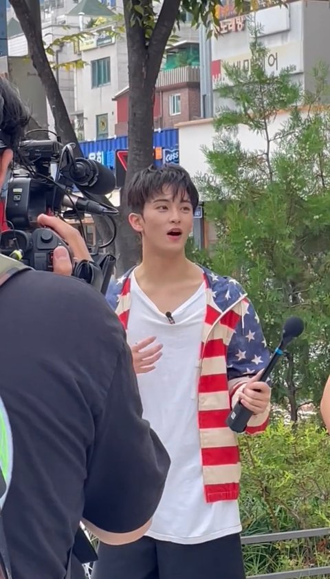 미국 국기를 입고 홍대에서 촬영하는 잘생긴 캐나다인