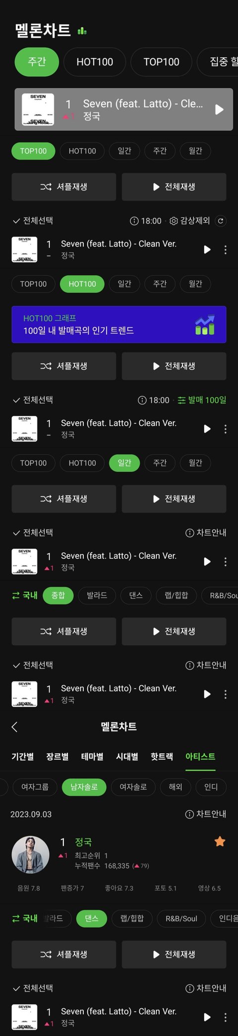 정국팬들은 첨에 멜론 핫백 1위 탑백 1위찍은거만 해도 감사했는데 사람이란게 자꾸 욕심이 생기는건 어쩔수 없더라 ㅋㅋㅋㅋ 11시간만에 탑백 1위찍고 실차 계속 1위하면서 1위랑 이용자수 계속 좁혀지니까 혹시 이러다 일간도 1위 가능? 그러다 진짜 일간1위하니까 넘나 기쁨의 내적댄스 췄는데 일간 1위도 하루하루 더 찍다보니 주간 1위도 되는거 아냐? 하다가 진짜 주간 1위 찍음 ㅋㅋㅋㅋ 진짜 정국이 너무 기특해 죽겠어 ㅠㅠ