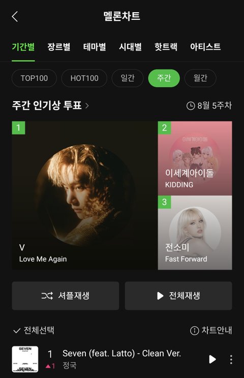 8월 30일인 지난주 수요일 올해 남돌 최초로 멜론 일간1위 찍고 오늘 드디어 남돌 최초로 멜론 주간 1위까지 함