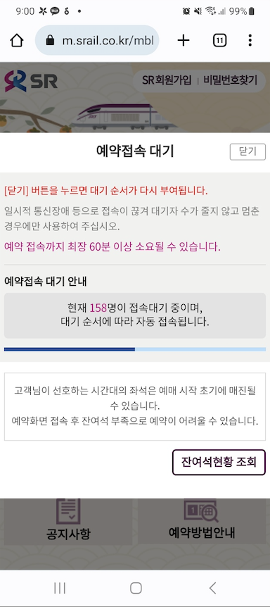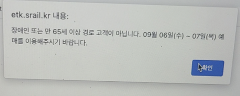 연결이 안된다고 바로 끊는 SRT고객센터에 20차례의 시도끝에 연결해서 오늘 전국민 예약되는게 맞냐고했더니 상담원은 '오늘 경로 장애인만 가능해요'라고 앵무새처럼 반복하더라구요.