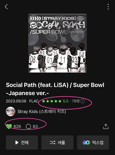 소셜패스 앨범 평점 5점으로 해주고 앨범 좋아요, 각 곡에 들어가서 좋아요 눌러줘 그리고 댓글도 한 번씩만 달아주면 좋을 거 같아:)