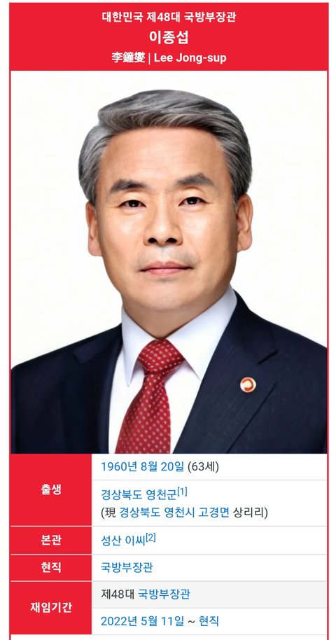 (사진4 설명) 이종섭(李鐘燮, Lee Jong-sup) 국방부장관 <출처 : 네이버 나무위키>