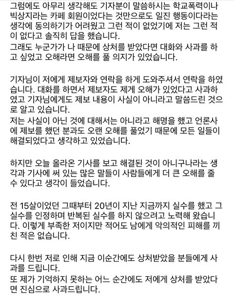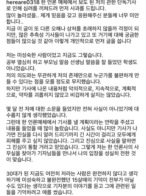 지금은 올라왔다가 내려간 인스타 입장문인데, 요약하자면 >>학교폭력을 했다.<<라는 것 자체는 사실이 아니야. 김히어라(이하 배우님으로 통일할게)는 네이트판 동창생들 인증글만 봐도 알 수 있듯이, 일반친구나 일진 할거없이 다 친하게지내던 발넒은 사람이였던거같아. 그리고 원주는 워낙 시골이라 좀 예쁘거나노래만 잘 해도 "빅상지"라는 카페에 가입할 수 있었던걸로 알아. 또한 디스패치측에서 처음 연락이 왔을때도, 인터뷰에 응하고 제보자와 오해가있어 오해를 푼 뒤 디스패치측에 알렸고, 그대로 끝난줄 알았으나 배우님과 합의 없이 갑자기, 마음대로 기사를 올린거란거지.