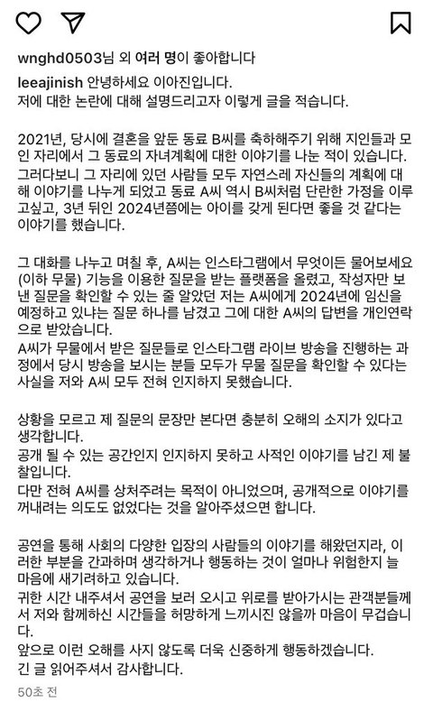 2021년쯤이였나? 정우연 배우님 인스타 라이브 무물에 김히어라 배우님이랑 이아진 배우님께서 "임신언제?" "임신2024예정?" 같은 글을 남겼고, 해당 무물을 신고하던 사람이 김히어라 배우님과 이아진배우님이 남기신걸 알게되셔서 글을 올린건데, 양쪽 입장을 다 살펴보자.