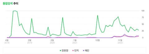 이렇게 말하면 꼭 장원영은 연차가 많아서 높은거라 그러는데 이게 장원영 데뷔때부터 지금까지 월간 검색량임