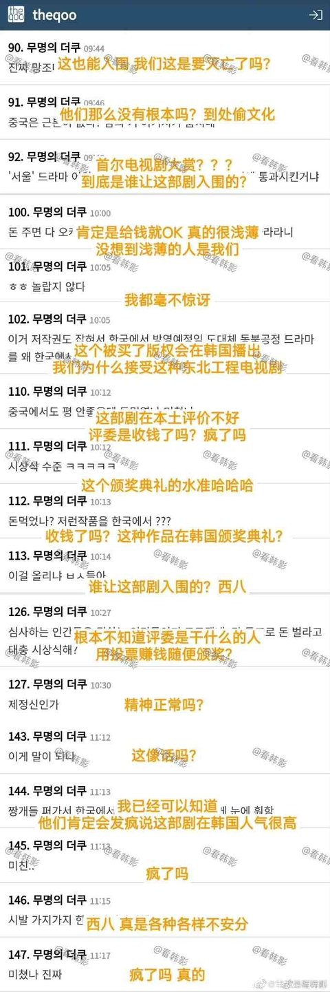 배우가 동북공정 드라마로 상 받으면 속이야 좋아도 쪽 팔려서 닥친 채 이번엔 오지마라고 빌어야 될 상황인데 그 나물 그 수니인지 더 존빡치네 확 마
