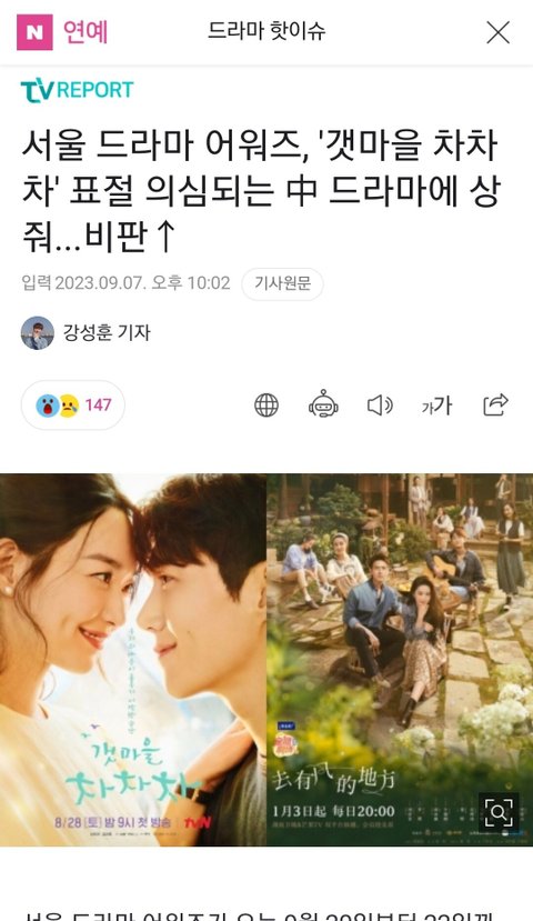 서울드라마어워즈, '갯마을 차차차' 표절 의심되는 中 드라마에 상 줘...비판↑