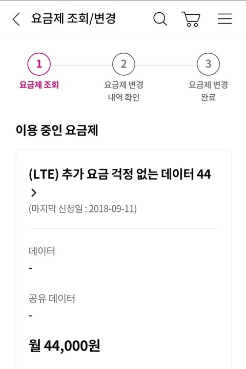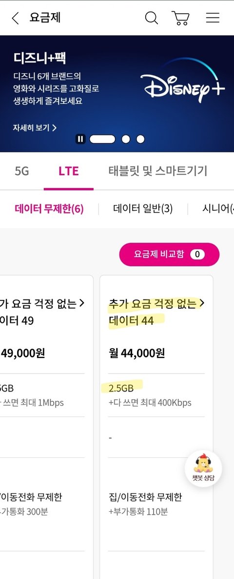 제가 5년째 사용 중인 요금제는 LTE 추가요금 걱정없는 데이터 44입니다.