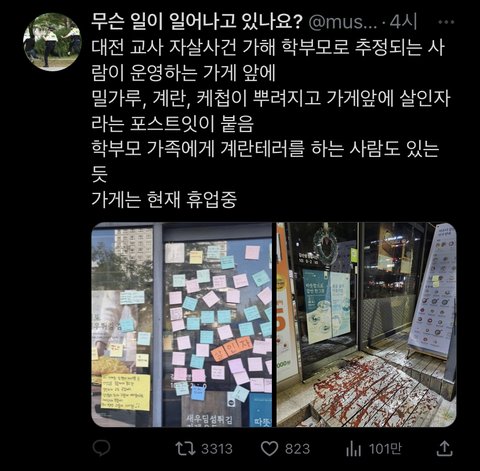 가해 학부모 가게에 사람들이 쪽지 붙여 놓고 음식물 테러하는 거