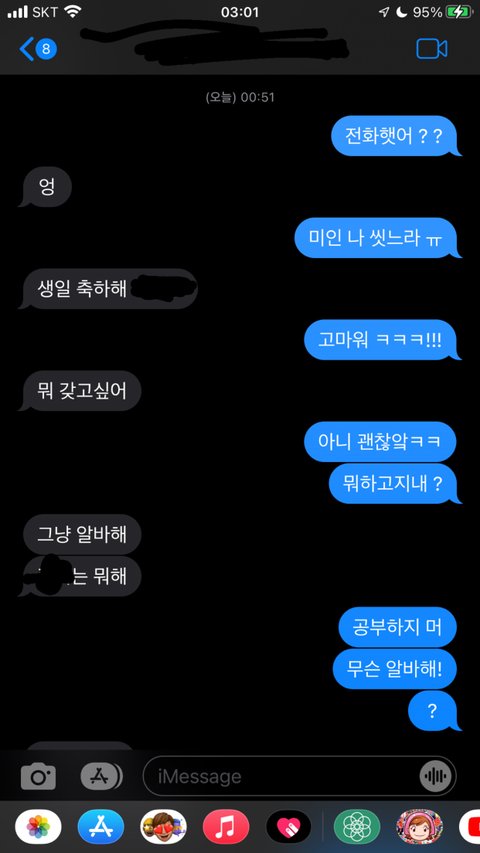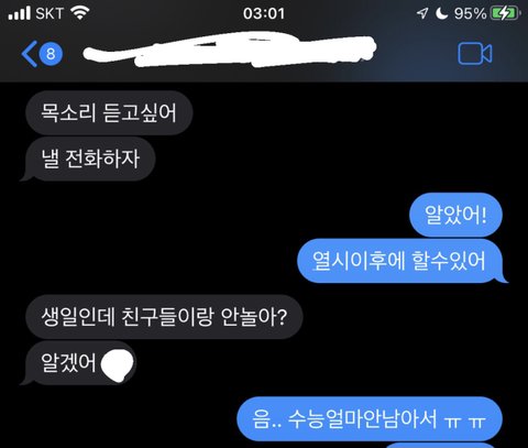 재수생이고 상대는 오빠임 5월까지 썸타다가 6평이 너무 충격적이게 나와서 내가 먼저 연락 그만하자고 했거든? 오늘 내 생일인데 부재중 떠있길래 문자보낸내용임 이 오빠 아직도 나 좋아하는거같음? 솔직히 나도 많이 좋아했는데 수험생이기도 하고 삼수는 도저히 못하겠어서 마음 접으려고 했었거든.. 하 수능끝나고 고백해볼까