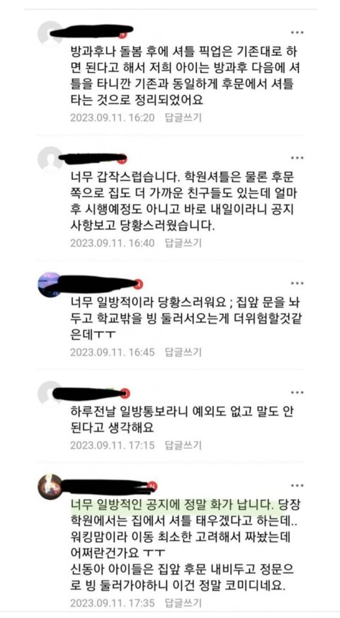 학교가 당연히 우리 애기 학원차 스케쥴에 맞춰줘야 되는데 감히!!! 우리 애기는 새끼 천룡인이라 정문에서 후문까지도 못 걷는데학교 주제에 학원을 배려하지 않았다고 매우 분개하시며 또다른 민원을 준비하고 계십니다.