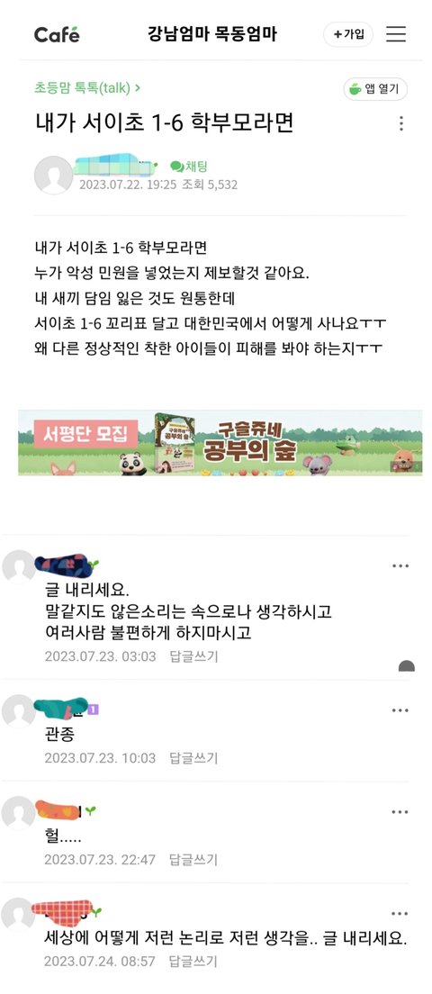 서이초 사건으로 근조화환이 줄을 잇든 말든 맘카페에서 새로운 민원거리를 찾는 우리 서초 맘님덜~~~