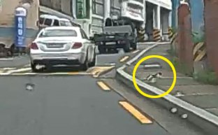 두손으로 매달려서 한다리로 두번, 세번 뛰더니 겨우 인도 위로 올라갔다. 인도 끝에 조그맣게 자란 풀숲으로 들어가길래 뒷 차 확인하고 얼른 차를 세웠다.