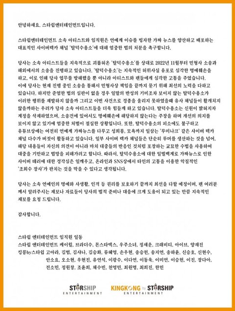 방금 올라온 건데 스타쉽이 탈수한테 민형사상 책임을 끝까지 물을거라고 함