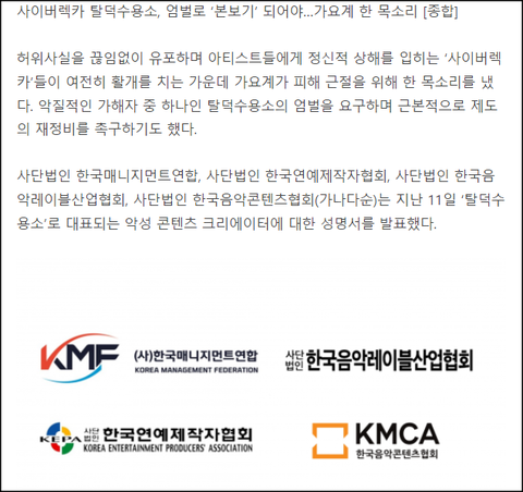 여기에 가요계도 탈수 엄벌에 처하라고 공동성명서 냈음