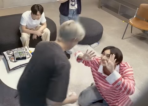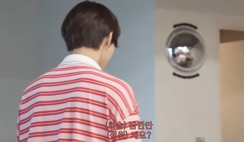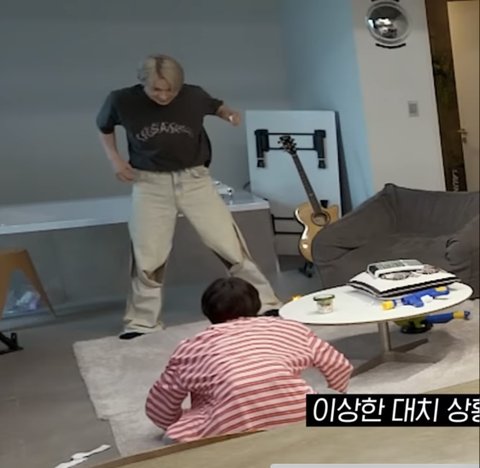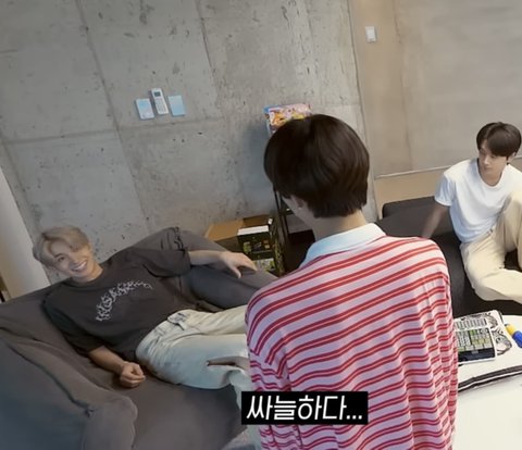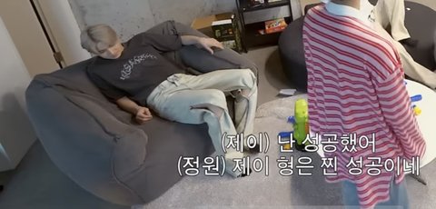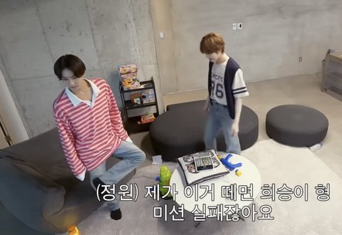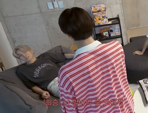 희승 미션이 멤버들 발바닥에 스티커 붙이기인데 정원이랑 서로 돕기로 협상하고 정원이 발바닥에 스티커 붙여놓은 상황