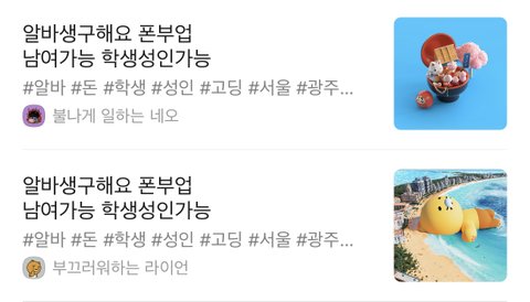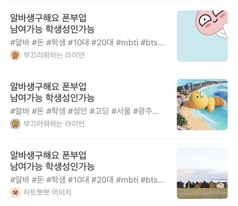 1대1 오픈채팅방에 학생성인 모두 알바 가능이라고 하면서 폰 부업이라고 올라오는 거 있거든? 그거 절대 하지마. 그거 사기야 내가 당한건데 그 사람들이 올리라는 제품들 당근이나 번장, 블로그에 올려서 파는 건데 돈은 걔들이 먹고 튀고 올린 애들은 돈 물어내줘야해 난 대리거래가 불법인지도 모르고 했다가 걔네들이 튀어서 어쩔수없이 부모님돈으로 매꿨어 진짜 다시 생각해도 이걸 믿은 내가 병신 같다 ㅅㅂ