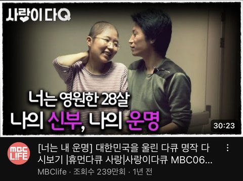 암에 걸린 여자분이 웨딩드레스 입고 남자분이랑 눈물 흘리는?그런 영상이랑 슬픈 발라드랑 믹스해서 릴스나 쇼츠에 자꾸 뜨는거임 그래서 나는 영화나 드라마인줄 알았는데 찾아보니까 다큐더라.. 궁금해서 30분짜리 풀영상 봤는데 30분 내내 오열함 진짜 미쳤음 내가ㅠ이렇게까지 울 수 있는 사람인줄 몰랐음 나는 원래 내가 겪었던 일이거나 막 감정이입을 해야 눈물이 나는데 이건 그럴 겨를도 없이 그냥 이 두사람의 이야기를 보는 것만으로도 눈물이 줄줄 남 두 분 감정선이랑 연애스토리랑 말하는 거 다 영화같고 현실을 초월한 사랑같음