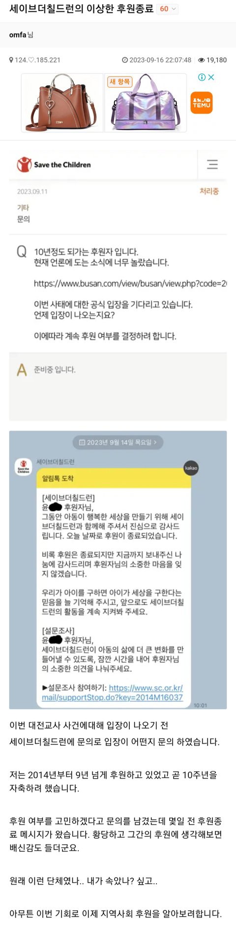 대전교사사건 세이브더칠드런의 이상한 후원취소