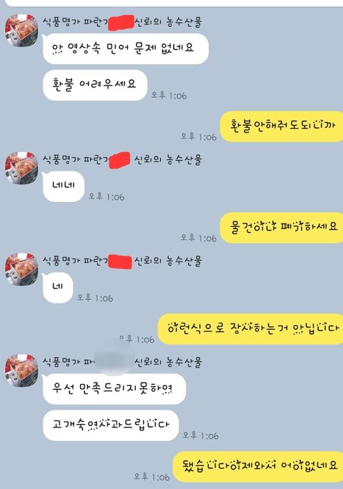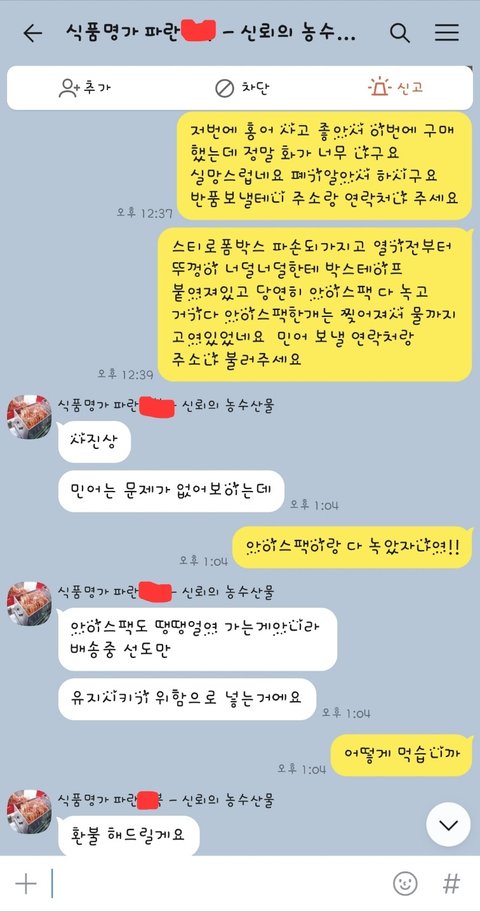 인터넷에서 쇼핑을했는데 이업체 너무 괘씸해요받았을때 스티로폼박스도 뚜껑 파손되어있고 열린상태나 마찬가지 얼음팩 다녹았는데 신선도유지시키기위함이지 땡땡얼려가는게 아니래요 한개는완전 녹아있고, 한개는찢어져서 물이 흥건한데 아무리 반건조생선이라도누가 먹나요 탈나려고 먹나요 문제가있는게 아니래요 환불은둘째치고 응대가 너무괘씸해요 영상속 민어는 문제가 없어서 환불이 불가하데요 너무 화가나네요 여지껏 해산물 많이 사봤지만 얼음팩이 두개가 다 녹아서 오는경우 처음이에요 그더운여름에도 꽝꽝얼려있거나 차가운정도 가 있는데 이건 벌써 받았을때부터 아이스팩이 찢어져서 녹아가지고 미지근하더라구요 응대가 어떻게 저러나요 저도 반품 담당 20년 가까이 되는데 저런 응대 처음봐요.더구나 먹는거가지고 참.....다들 당하지마시길 바라는 마음으로 글올려보네요 아직도 화가 가라앉질 않아요 동영상은 안올라가서 사진캡쳐한거만 올려보아요환불안해줘도 된다니까 그제서야 인사하는 업체 CS기본도 안되어있고제품배송에 대한 기본도 원칙도 없는 회사