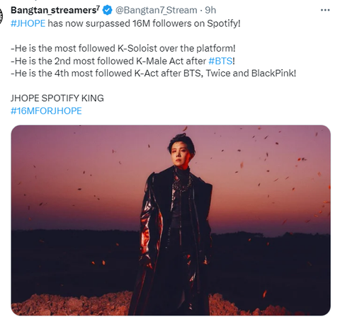 제이홉 오늘 스포티 팔로워가 16,000,000 (천 육백만명) 넘었음 이게 국내 솔로가수 중 최고기록이래.