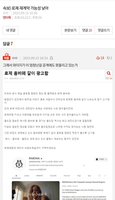 로제 재계약 안했다고 리모와 광고 공계에 안올렸다면서