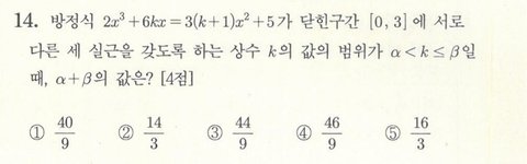 대충 이런 그래프가 그려져야 [0,3] 사이에서 서로 다른 세 실근을 가질 수 있다는 것을 알 수 있다