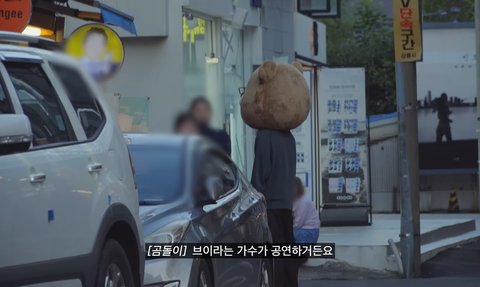 신인가수 브이가 곰돌이 탈 쓰고 버스킹함