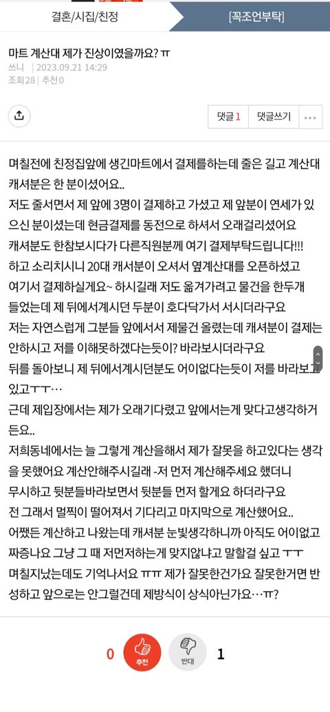 원본지킴할정도는 아닌거 같은데...원본 쓰니는 본인이 젤 오래 기다렸고 다음 계산순서이니까 옆계산대 앞에 선거고, 뒤 사람들은 옆계산대 열리니 신나서 옆 계산대 앞에 선거고, 문제는 캐셔의 대처방법인데 거기서 그렇게 진상처럼 느끼게 눈빛쏘면 누구라도 기분나쁘지 중립적으로 이건 이렇다 저건 저렇다 양해바란다해야지 안그래도 요즘 흉흉한데 서로서로 조금씩 이해하며 삽시다