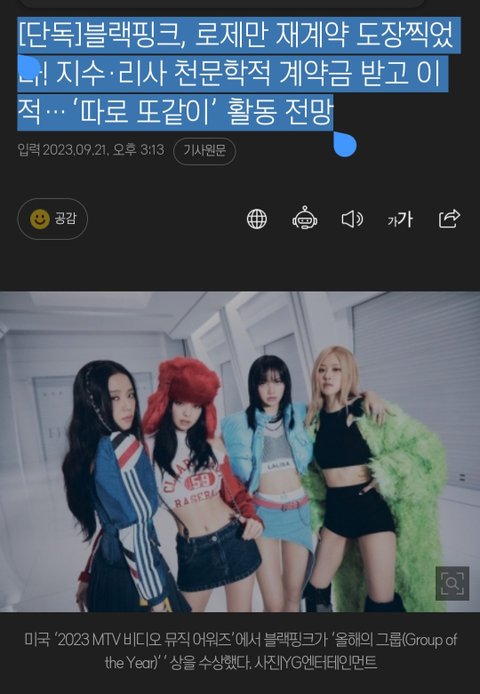 21일 복수의 가요계 관계자에 따르면 블랙핑크 멤버 로제가 YG엔터테인먼트와 재계약에 합의하는 도장을 찍은 것으로 전해졌다. 나머지 세 멤버 제니, 지수, 리사는 YG엔터테인먼트가 아닌 곳으로 소속을 옮기게 되었다.