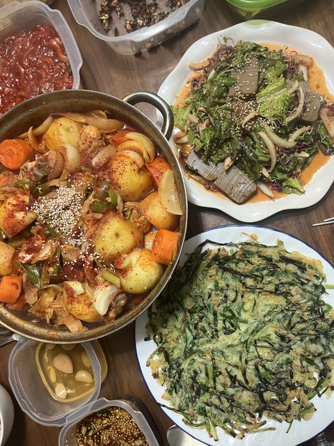 요리는 순서대로 가지튀김 참치야채비빔밥 오꼬노미야끼 수육 돈까스덮밥이랑 두부김치 김치두루치기랑 고추장찌개 스팸감자짜글이 짜장면 닭갈비 닭볶음탕에 전이랑 도토리묵 무침입니다 :) !!!