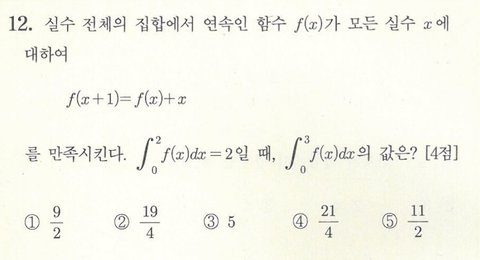 +) 사실 이번 문제는 너희들이 안 까먹고 주기함수 적분을 할 수 있는지 가져온 거라 알려줄 건 거의 없어... 그나마 적분의 평행이동은 미적분에서 유용하게 쓰이기 때문에 미적분 선택자들은 평행이동에 꼭 대칭이동!!!까지 알아뒀으면 좋겠음