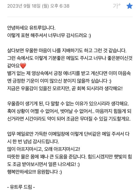 제가 좋아하는 유튜버에게 메일을 보냈는데 이런 답장을 받아서 함께 보고자 공유하려 가져왔습니다