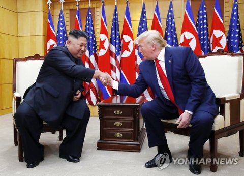 (사진1 설명) (서울=연합뉴스) 배재만 기자 = 도널드 트럼프 미국 대통령이 30일 오후 판문점 자유의 집에서 북한 김정은 국무위원장과 만나 악수하고 있다. 2019.6.30 scoop@yna.co.kr