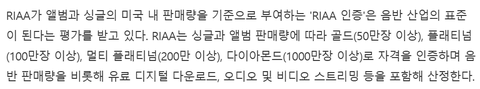 미국 플래티넘 인증(싱글+앨범 총판 100만 돌파 시 되는건데 싸이 이후로 솔로로는 두번째)