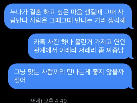님 좀 말하는 거 애 같음 아직 공개하고 싶지 않은데 님이 관계 공개적으로 올려버렸는데 존중받지 못하는 느낌 받는 거 당연한 거 아닌가 사과해야 할 상황이지 님이 화낼 상황이 아님 사랑하면 그냥 내가 뭘 하든 받아줘라? 걍 말도 안 되는 얘기