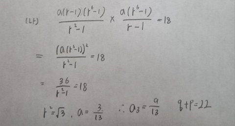 수열의 합 사이에 (-1)을 교차로 곱해준다는 것은 음수인 항들과 양수인 항들을 서로 묶어주면 공비가 r²이 될 것이고 또한 항의 개수가 각각 3개 이므로 합공식을 쓰면 (r⁶-1)의 식이 나오니까 바로 식을 세우면 되겠다.