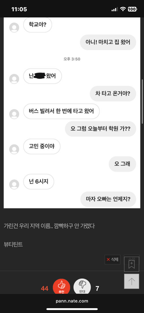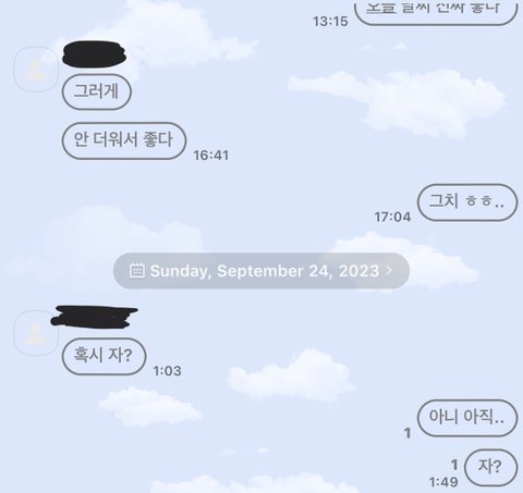 저거 오늘 한 대화 끝이야 내가 오늘 날씨 좋다 이런거 이후로… 아 어떡해..