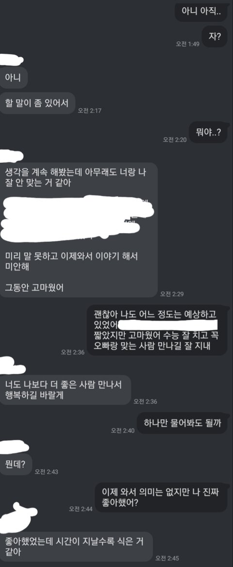 아 나도 카톡으로 이별통보 받아서 그런가 진짜 개열받는다 지가 헤어지고 싶을 때 일방적으로 통보하면 다임? 안 좋게 이상하게 헤어지는 거 아닌 이상 만난 기간이 길든 짧든 마지막은 얼굴 보고 마무리해야지;;
