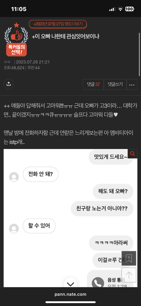 이 오빠가 나한테 관심 있나 물어본 거로 확실해보인다고 7월에 톡선도 갔었는데 ㅎㅎㅎ