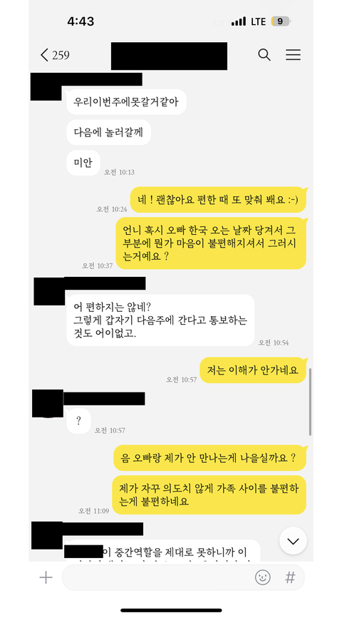 이 이후에도 저는 부모님께 제 이야기를 들어달라는 전화를 수십번을 하였지만 들어주지 않으셨고 계속해서 화를 내고 계십니다. 또한 저의 생각을 글로 적어 보냈음에도 불구하고 저희 가족 구성원중 단 한명도 저에게 연락이 없습니다. 저희는 아직 어떠한 결정도 내린것이 없고 아직도 서로를 알아가는 단계입니다.