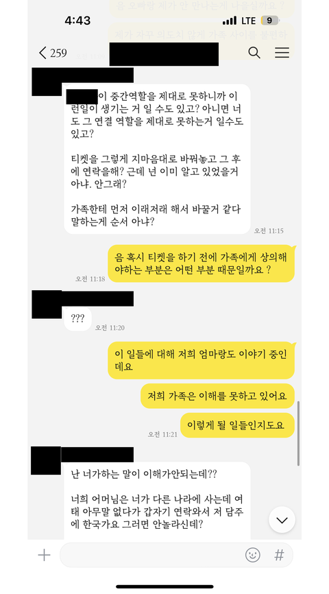 엄마와 통화를 마치고 누나와 통화를 하는데 티켓을 변경하였다는 말에 바로 표정이 굳어지면서 무슨 이유냐 물었고 엄마에게 한 말과 같이 이런저런 이유로 변경하게 되었다고 말 했습니다. 그 때 누나는 어이없다는 표정을 지으며 여자친구 때문이네 라고 하더라구요. 완전히 아닌것은 아니기에 뭐 그것도 맞다라고 말 했습니다. 누나는 11월에 환갑 계획이 있었는데 이렇게 되면 틀어지지 않냐 하면서 화를 내더라구요. 저는 날짜를 들은것도 아직 없었기에 충분히 조정 가능하다고 생각했습니다. 그렇게 전화를 마치고 나서야 여자친구에게도 전화하여 날짜가 어떻게 되는지 말 해주었습니다.