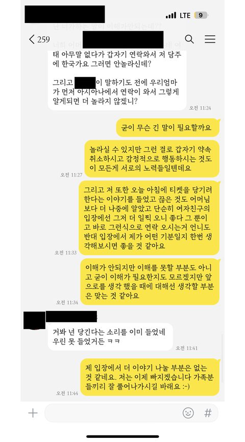 그렇게 3개월 가량 시간이 지났고 11월 중순에 한국에 잠시 나가기위해 티켓을 끊었습니다. 때마침 아버지 환갑도 있기에 가족들과 계획을 세우기로 하였고 아직 정확한 날짜나 계획이 잡히지 않았습니다. 그러다 저의 하는 일에 문제도 좀 있고 여자친구와의 문제도 있으며 이런저런 이유로 티켓을 앞당기게 되었습니다. 티켓을 변경하는 당시 여자친구와 통화중이였고 여자친구에게는 티켓 변경한다는 말을 하고 전화를 끊고 티켓을 변경하였습니다. 티켓 변경과 동시에 부모님께 티켓 변경이 되었다는 연락을 받았다고 연락이왔고, 왜 바꾸셨냐기에 이런저런 이유로 변경을 하게 되었다 안그래도 전화 드리려했다고 말씀 드렸습니다. 그리고 바로 하시는 말씀이 한국에 아예 돌아올 생각이냐는 말에 그건 아직 결정된 부분이 없다 하지만 가능성을 배제할 수는 없다고 말씀 드렸습니다.